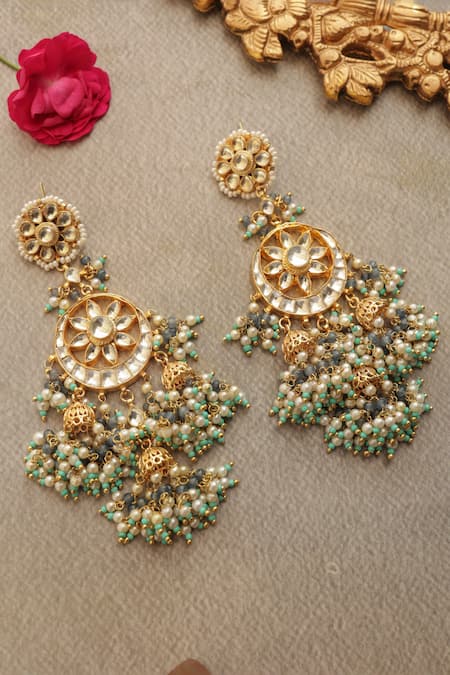 Intricate kundan work with pearl embellishments, Natural stones and onyx stones detailing, Dramatic jhumki design with cascading beads