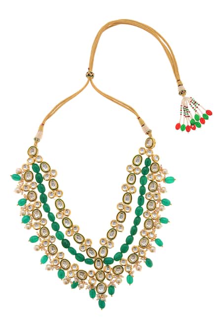 Gold-plated layered necklace featuring multi-green stone strings and encrusted kundan