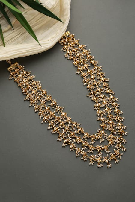 Gold layered necklace featuring kundan encrusted teardrop chain and cluster bead drops