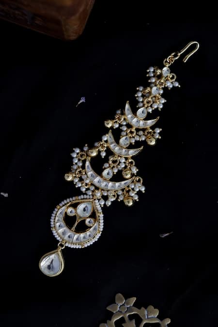 Gold plated maangtikka featuring teardrop shape kundan hangings and pearl embellishments