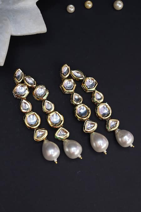 Geometric motif dual-string danglings, Encrusted kundan detailing, Pearl drop embellishments