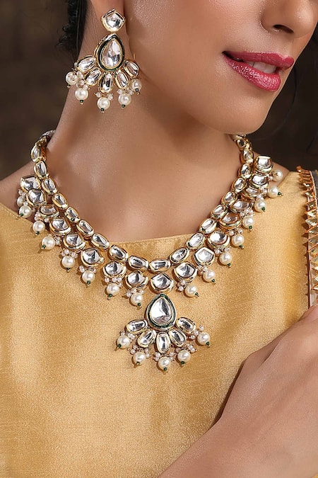 Gold layered necklace featuring encrusted kundan, teardrop pendant drop, and cluster pearls. Paired with matching earrings that complement the necklace design.
