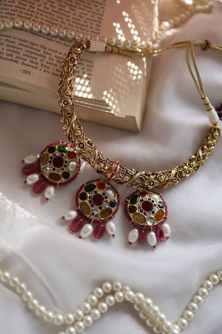 22kt gold plated with embossed hassli design, Dangling kundan motifs with pearl highlights, Encrusted with multicolored natural stones