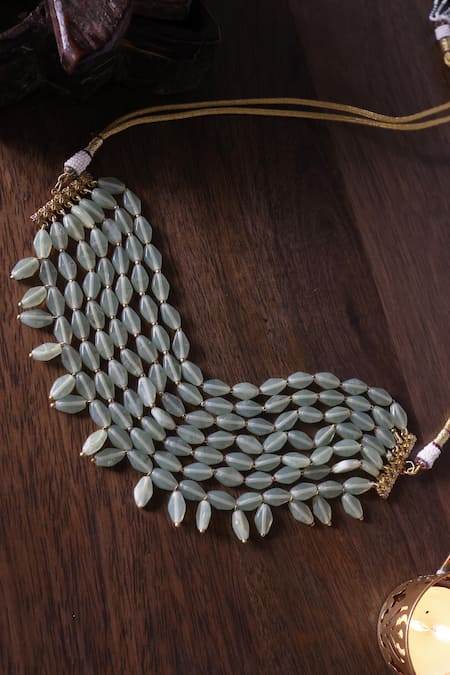 Mint green layered necklace featuring pearl and natural stone embellishments