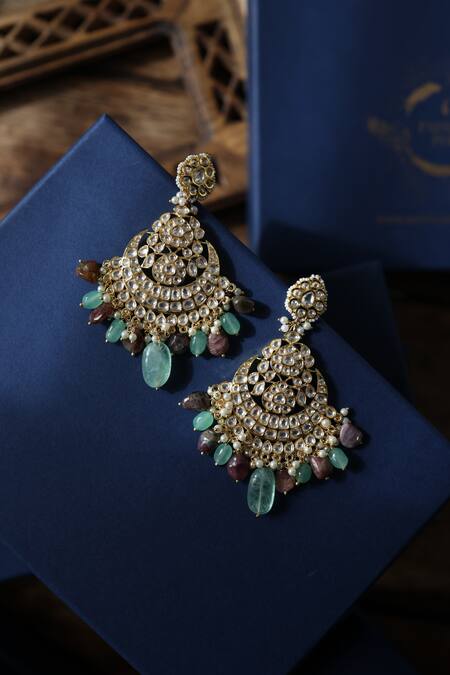 Floral pattern design with multicolored natural stones, Polki stone embellishments, 22k gold plating with intricate detailing