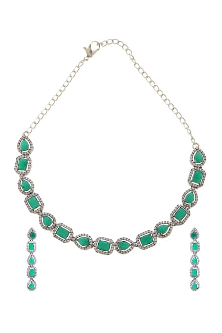 Gold geometric choker featuring encrusted faux diamonds and polki stones. Paired with tiered long earrings adorned with green stones.