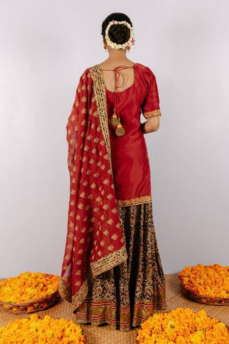 Maroon lehenga with kalamkari & paisley print all over. Paired with pitta zari embroidered top & dupatta.