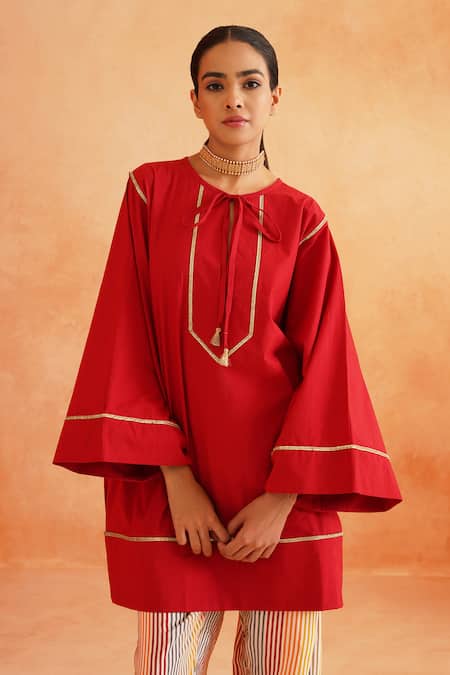Red kurta featuring lace embroidery, flared sleeves, and tie-up neckline. Paired with a chevron pattern pant.