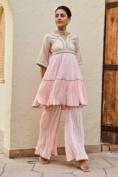 Pink flared kurta featuring stripe woven motifs and pearl embroidered placket. Paired with flared pant with embroidered waistband.