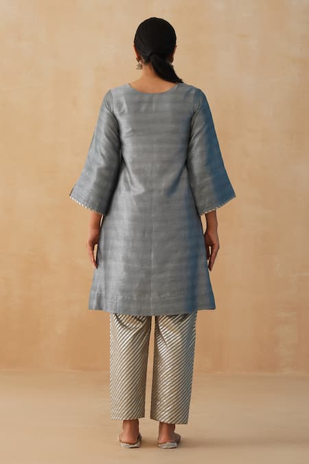 Grey kurta featuring a V-neckline, three quarter sleeves, and embroidered lace work on side pockets. Paired with striped pants and a floral printed dupatta.