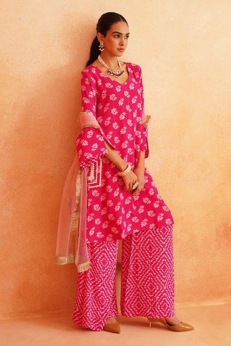 Pink kurta featuring a floral print with gota lace embroidery. Paired with a geometric print flared pant and dupatta with fringed border.