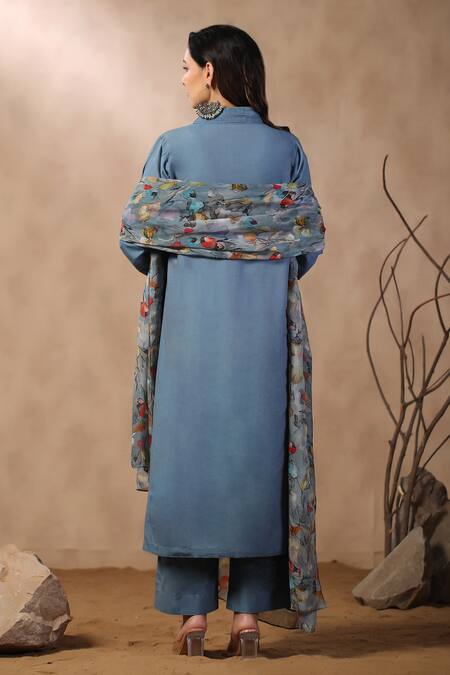 Blue floral printed kurta featuring a V neckline and three-quarter sleeves. Paired with matching cotton silk pant and a floral dupatta.