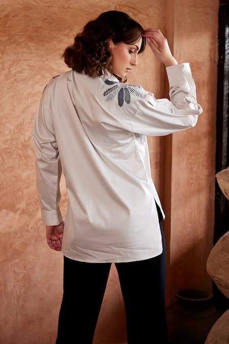 Grey Cotton Embroidery Collared Resham Floral Patch Shirt