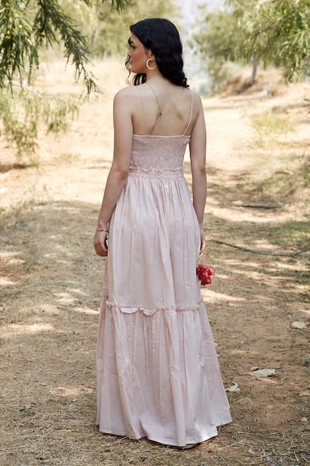 Pink tiered maxi dress featuring smocked, gathered, and ruffle detailing