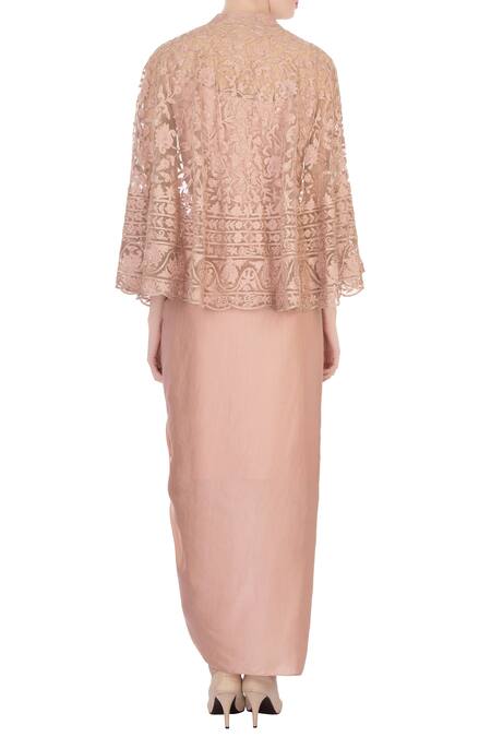 Buy_Aqube By Amber_Pink Cape Mandarin Collar Draped Skirt Set_Online_at_Aza_Fashions