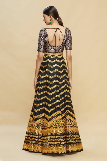 Black Raw Silk V Neck Embroidered Kalidar Lehenga Set