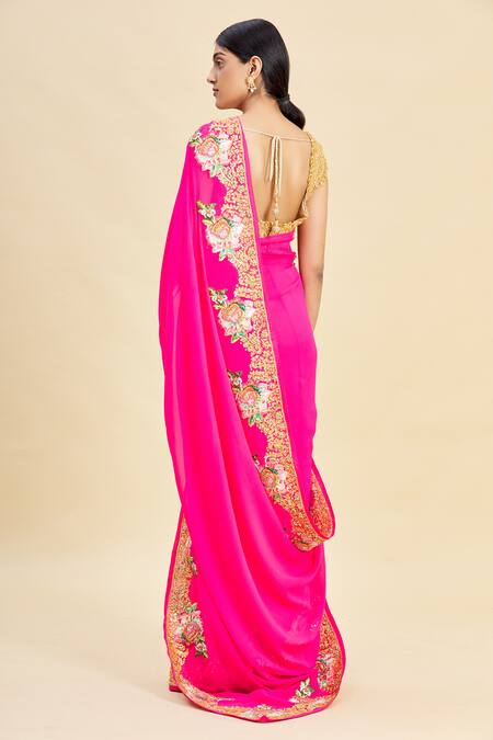 Pink sheer saree with sequin embroidered floral motifs on border.