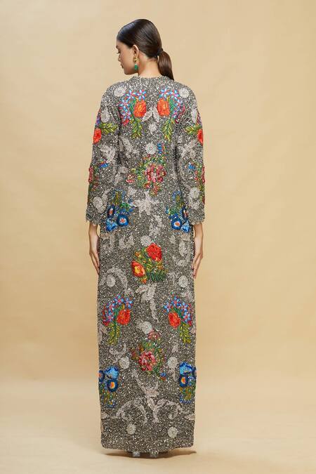 Multicolored jacket with sequin work & floral applique embroidered motifs. Paired with pant.
