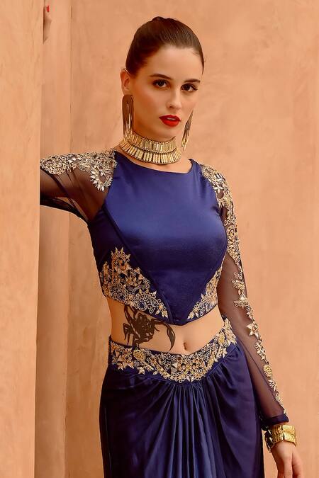 Cerulean blue embroidered corset featuring a round neckline and long sleeves. Paired with an ombre draped skirt adorned with dori, mirror, and twisted gota work, complete with a back tie-up and side zip closure.