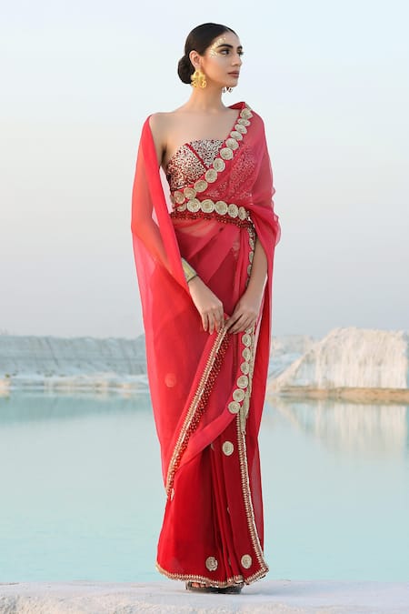 Raspberry red two-piece saree in chanderi & chiffon base with embroidered, tassel bordered palla. Paired with embroidered corset blouse in sitara work & belt.