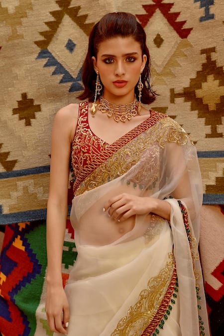 Back hook closure for the blouse, Intricate katori work on the saree, Embellished with green droplets