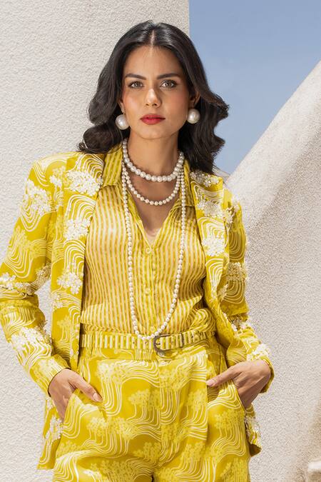 Lemon green blazer featuring floral fantasy print with pearl and bead embroidery. Paired with a printed shirt and pant, both designed for a relaxed fit.