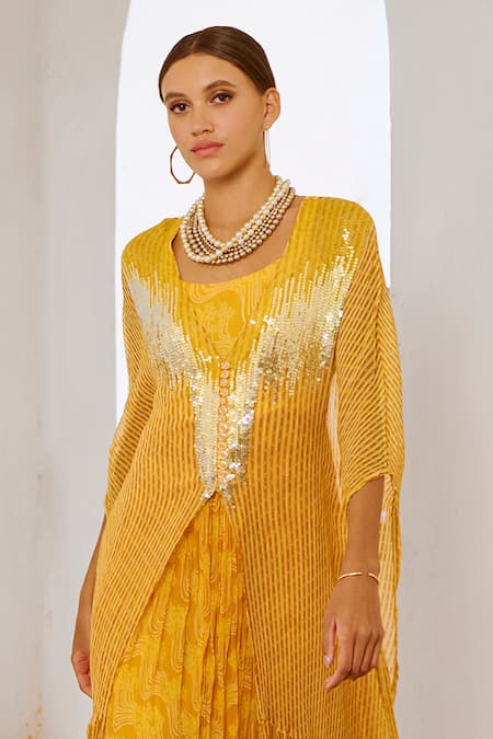 Marigold yellow kaftan featuring matchstix print and ombre sequin embroidered yoke. Paired with a spaghetti dress in a silk blend fabric.