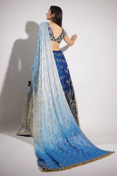 Blue ombre lehenga with all over leaf & paisley foil embroidery. Paired with raw silk deep V neck blouse with jaal work, gota, dabka & sequin embroidered dupatta.