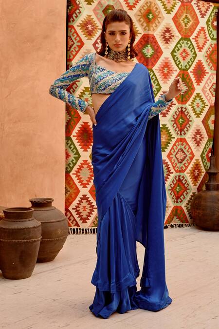 Cobalt blue pre-draped saree featuring an embroidered floral design. Paired with a multi-colored blouse with a sweetheart neckline and full sleeves, adorned with a back tassel tie-up.