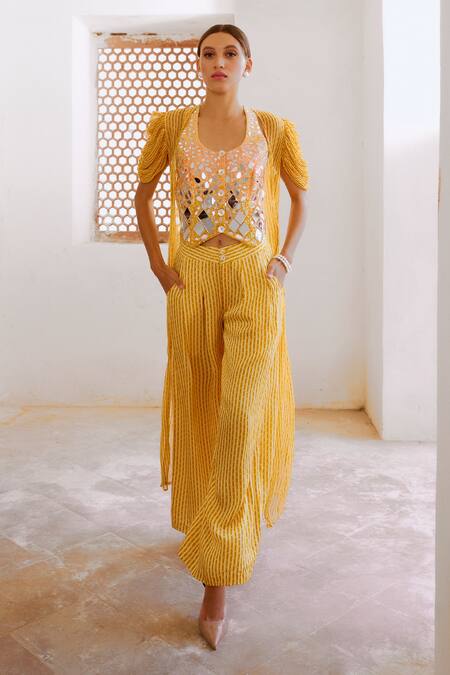 Marigold yellow jacket featuring reverse matchstix print and mirror-sequin embellished inner koti. Paired with flared pant in a silk blend fabric.
