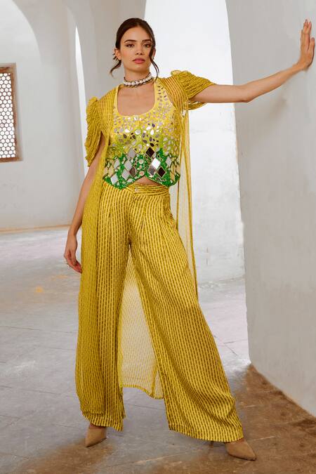 Lemon green jacket featuring reverse matchstix print with mirror-sequin embellishments. Paired with a coordinating flared pant and inner koti.