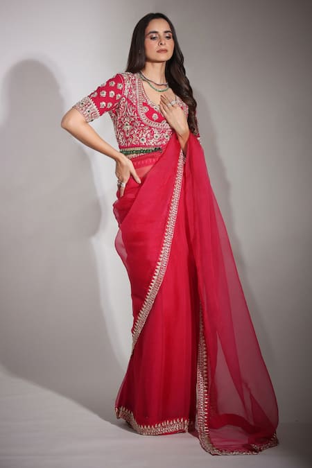Cheer red saree with embroidered border. Paired with deep U neck jacket with zardozi embroidery, half sleeves & round neck embroidered blouse.