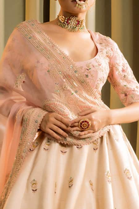 Ivory pink ombre lehenga featuring thread embroidered paisley and floral jaal motifs embellished with sequins and beaded tassels. Comes with a matching padded blouse and dupatta with a cut-out back design.