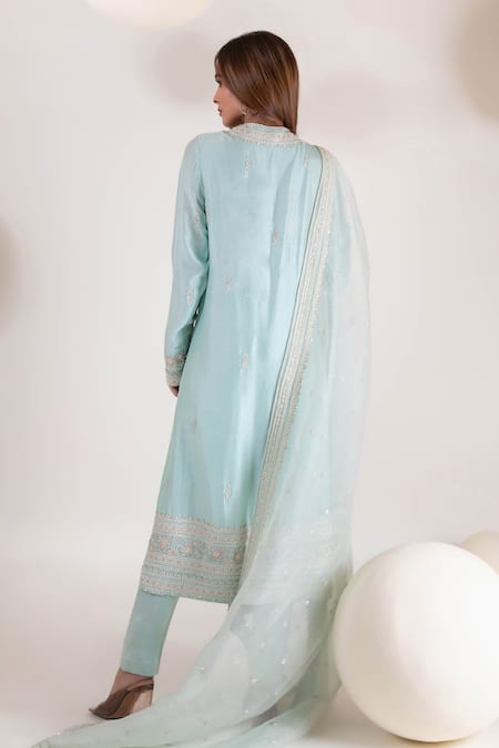 Aqua blue full sleeves A-line dupion kurta featuring bloom aari and zardozi embroidery with sequin highlights. Paired with a straight satin lycra pant and embellished organza dupatta.