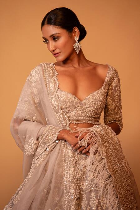 Ivory lehenga featuring intricate crystal, bead, pearl, and sequin embroidery in a floral pattern. Paired with a padded blouse and a feather-bordered dupatta.