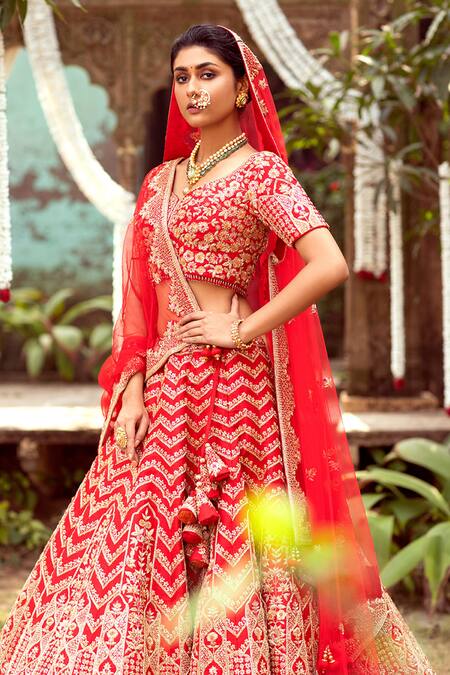 Red attached cancan lehenga on pure raw silk base with floral & geometric resham and zardozi hand embroidery. Come with embroidered, padded blouse & dupatta.