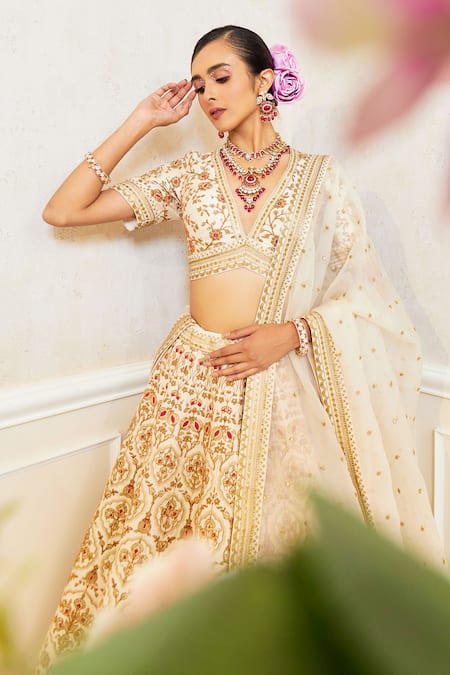 Ivory lehenga featuring all over bloom crest heavy embroidery with dori, resham & zardozi highlights. Paired with a half sleeves plunging V neckline floral embroidered padded blouse and an embroidered organza dupatta.