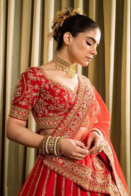 Red bridal lehenga featuring thread embroidered floral jaal motifs embellished with beads and sequins. Paired with a padded blouse with a cut-out back and a scalloped border embroidered dupatta.