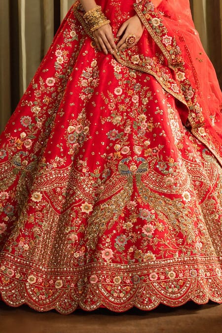 Red lehenga featuring zardozi embroidered floral jaal and scallop motifs. Paired with an embellished padded blouse and dupatta.