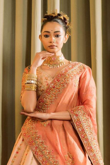 Peach bridal lehenga featuring zardozi embroidered floral jaal and peacock motifs along the panels. Accompanied by a padded blouse with a cut-out back and a dupatta embellished with bead tassels.