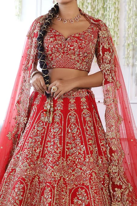 Red embroidered lehenga featuring intricate resham, zardozi & applique work. Accompanied by a padded leaf neck blouse and a tulle dupatta with embroidered cut work border.