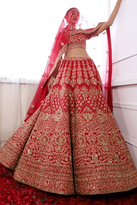 Red Silk, Tulle Embroidery, Sequins, Sahi Mor Botanical Bridal Lehenga Set