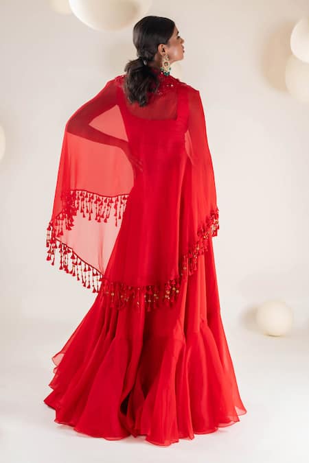 Red cape featuring tonal, sequin, floral embroidered yoke with tassel danglers. Paired with a matching inner blouse and tiered skirt.