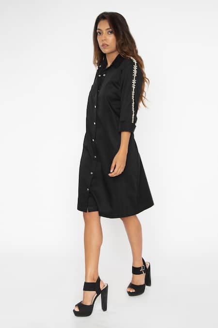 Black Cotton Satin Stones Collared Bejewelled Shirt Dress