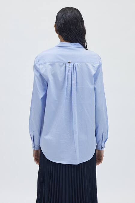 Blue Cotton Satin Embroidery Collared Button Shirt