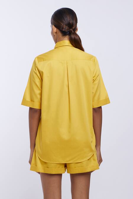 Yellow Cotton Satin Embroidery Collared Pocket Shirt And Shorts Set