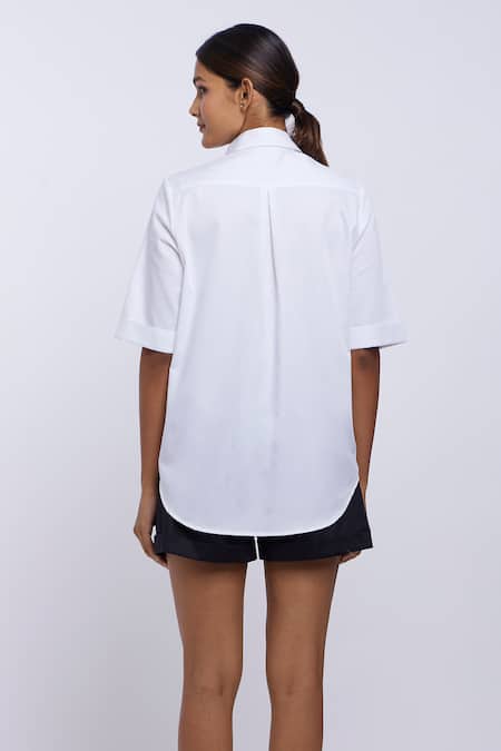 White shirt featuring hand embroidered pocket with pearls and Swarovski stones. Paired with relaxed fit shorts that include side pockets.