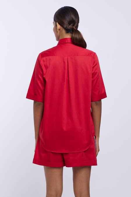 Red Cotton Satin Embroidery Collared Pocket Thread Work Shirt And Shorts Set