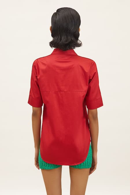 Red Cotton Satin Cut Work Collared Pop Hand Embellished Shirt