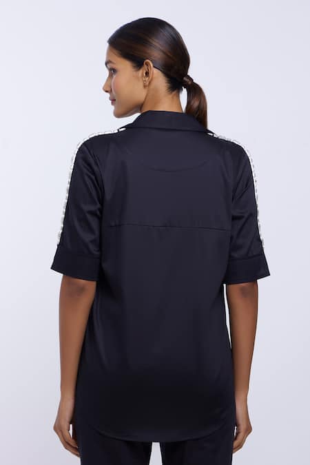 Black Cotton Satin Stones Collared Rectangle Swarovski Ribbon Embellished Shirt